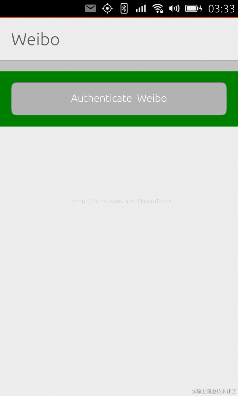 在这篇文章中,我们将使用Ubuntu SDK所提供的online account API来访问微博的API并显示所需要的内容。这篇文章的重点是展示如何使用online account API的使用。我们将创建一个简单的QML应用。我们最终显示的画面如下: