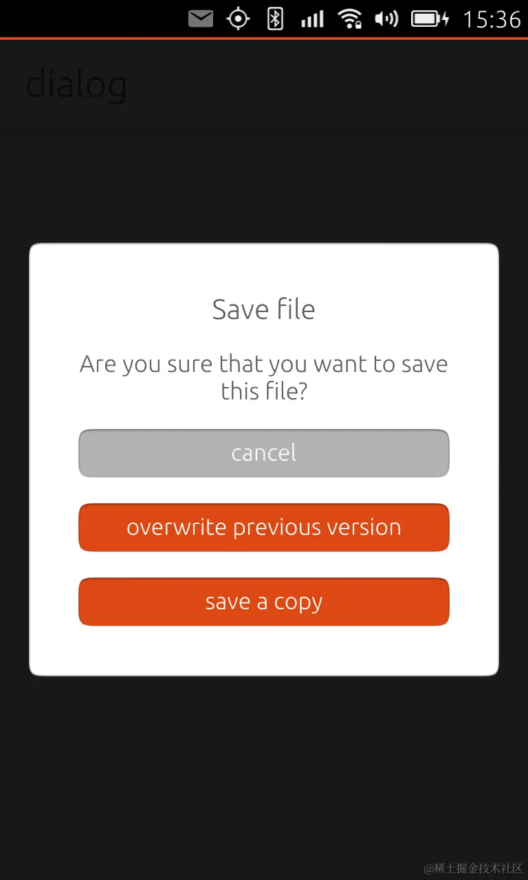 这里的设计因人而异。我们可以设计自己的按钮来销毁创建的Dialog,并同时传回自己的选择。这个方法的好处是设计的UI不必绑定特定的操作系统,比如Ubuntu。这样这样的代码可以在多个平台上运行。