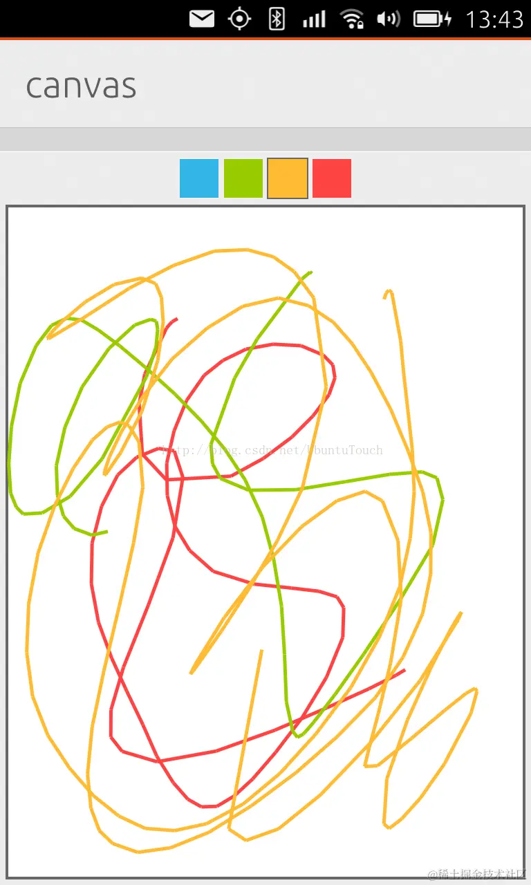 我们在上面设计了四个ColorSqaure。在下面我们使用了一个Canvas来画我们所需要的图。