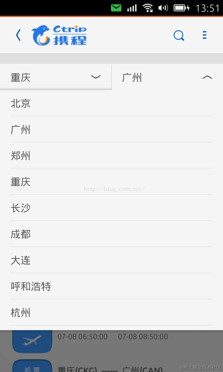 在上面的中间的图中,我们可以看到“重庆”被选中了,在第二个列中,我们可以使用我们的department来进行从一个城市到另外一个城市的搜索。