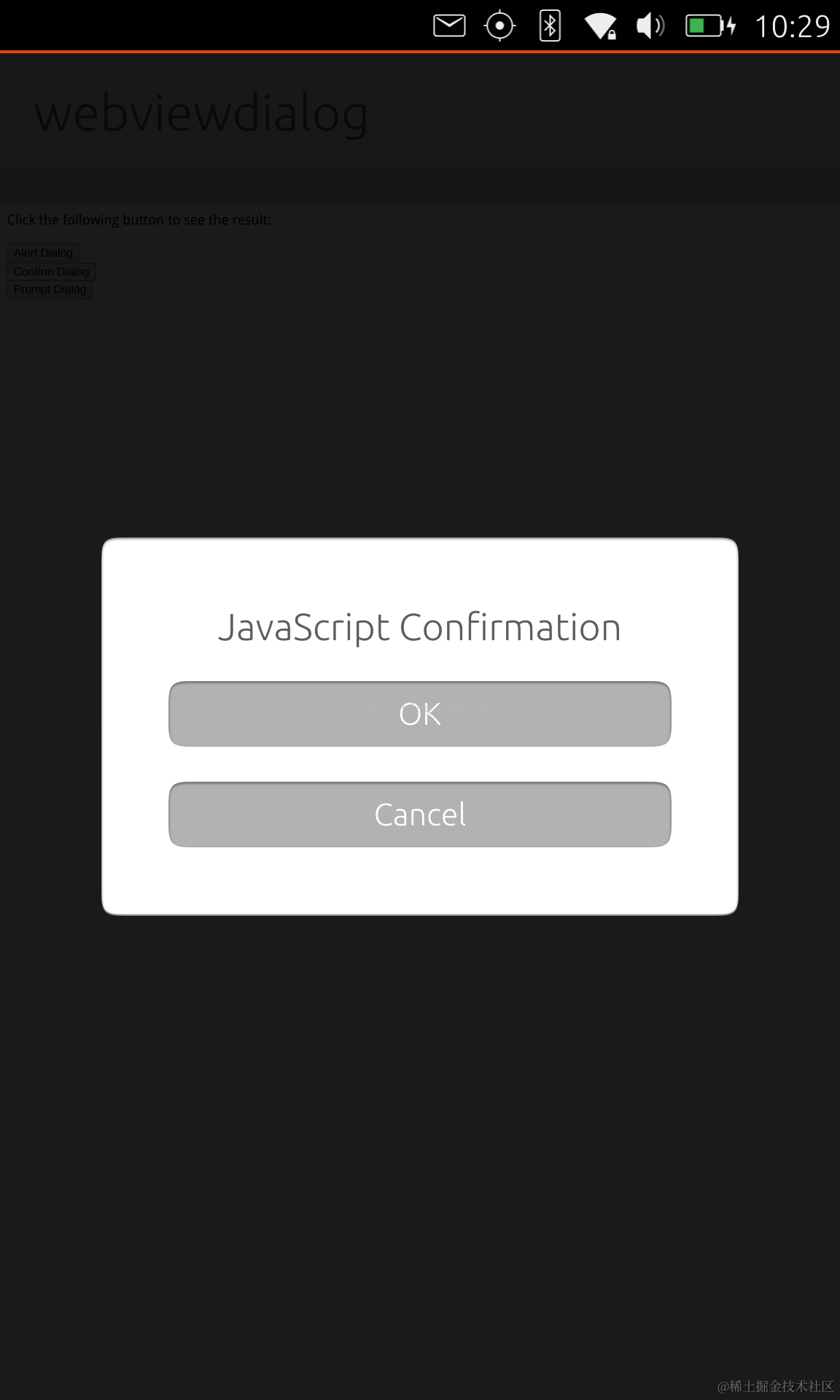 在这里,我们对alertDialog及confirmDialog进行了初始化,这样当我们在index.html中使用alert及confirm时,我们可以得到我们需要的Dialog: