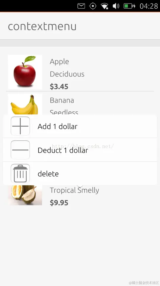 我们使用了一个空的Item来作为一个placeholder。这个是为了给我们在长按ListView中项时,来提供一个位置显示我们的Popup menu。