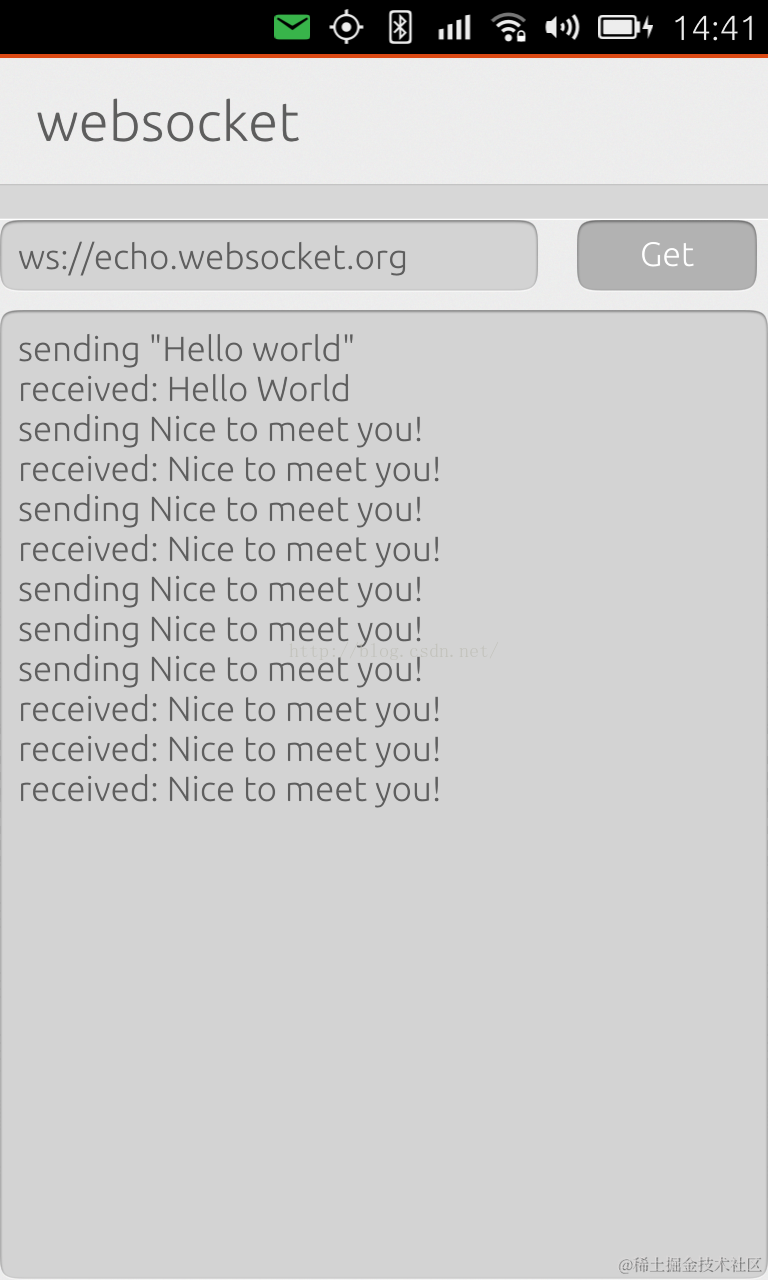 每当我们向这个地址发送信息时,就会得到和发送信息一模一样的信息(是一个echo服务器)。我们可以通过onTextMessageReceived来得到这个信息。