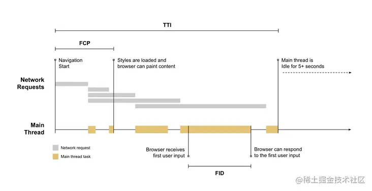TTI(Time To Internative): 从页面开始到它的主要子资源加载到能够快速地响应用户输入的时间. (没有耗时长任务)