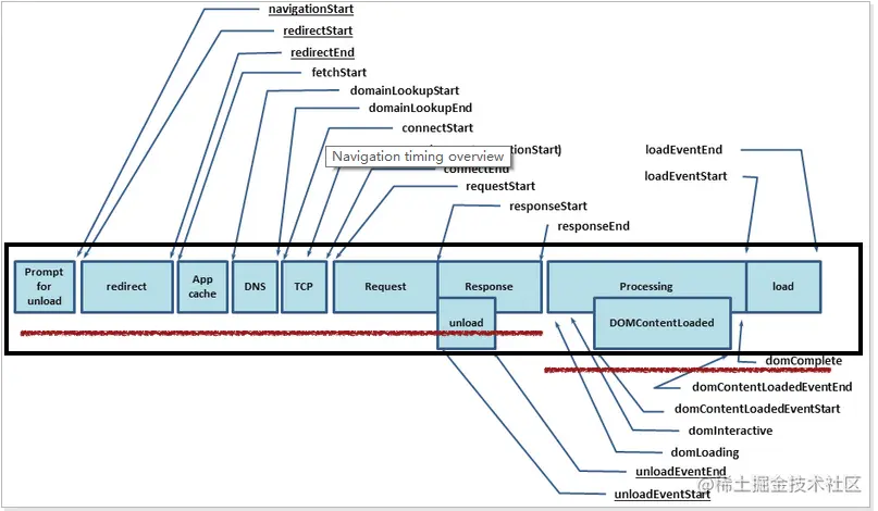 - navigationStart: 表示从上一个文档卸载结束时的 unix 时间戳,如果没有上一个文档,这个值将和 fetchStart 相等。