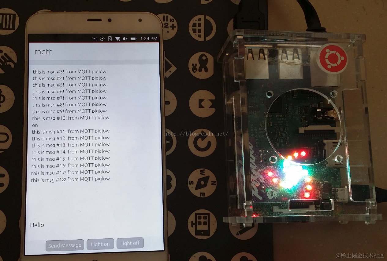 在界面的最上面,我们可以看到来做树莓派的消息(上面所说的心跳消息).当我们按下"Light on"按钮后,它通MQTT协议,向我们定义的TOPIC发布一个叫做"on"的消息.树莓派侦听到这个消息后,就会打开所有的灯(如上图所示).当然,我们也可以在屏幕的下角的地方,发动一个"Hello,the world"的消息给我们的树莓派: