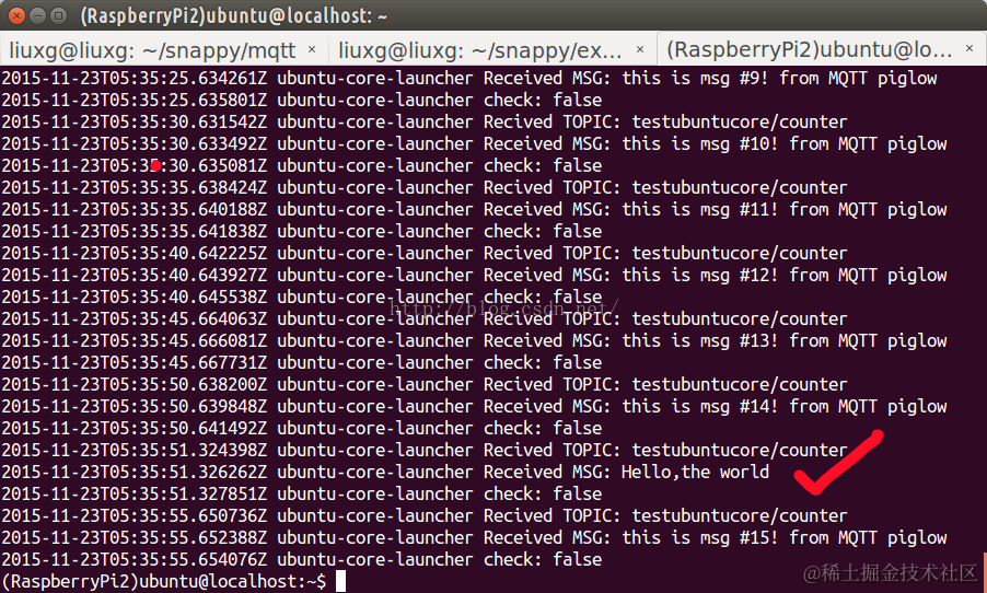 那么在我们的树莓派中可以使用如下的方法来查看我们收到的信息: