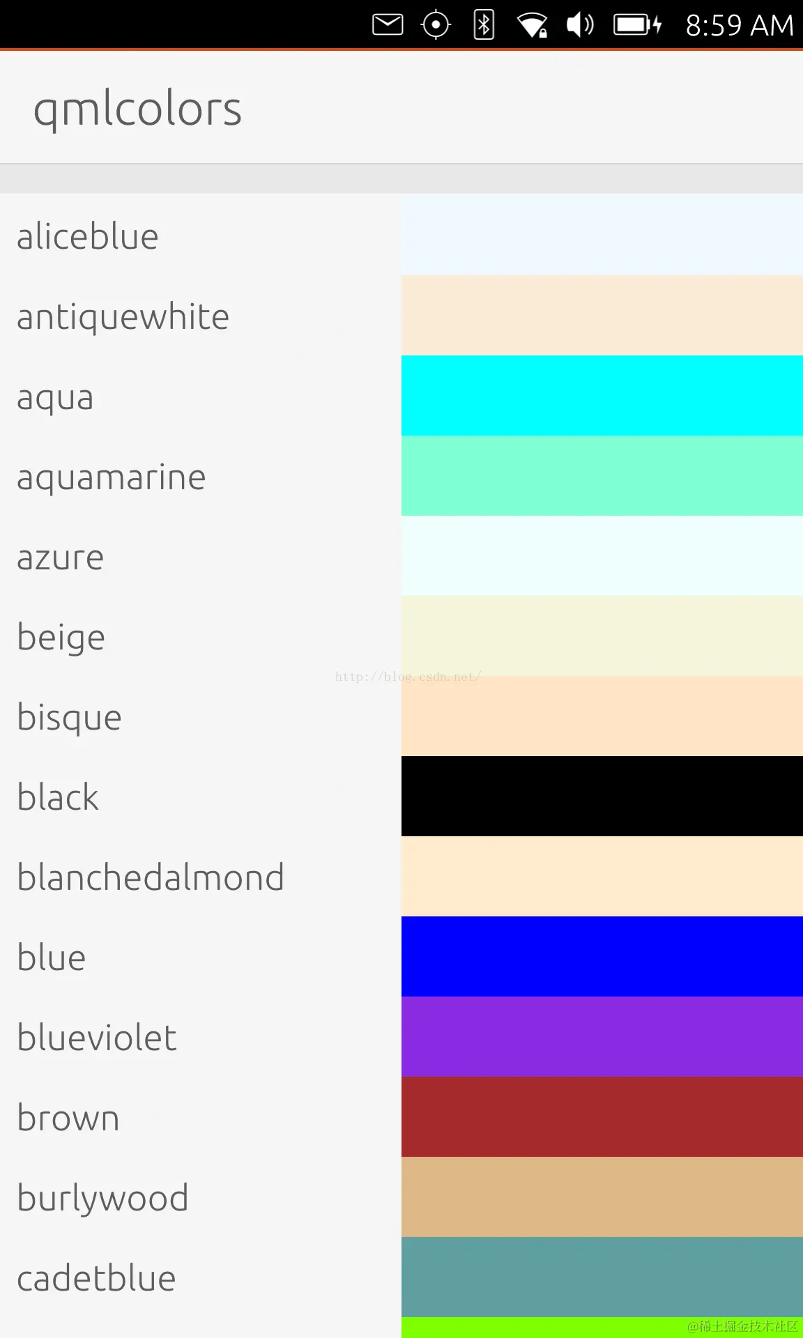 在这个QML文件中,我们把我们拿到的颜色名称,通过列表的方式进行显示.同时也显示出它的颜色: