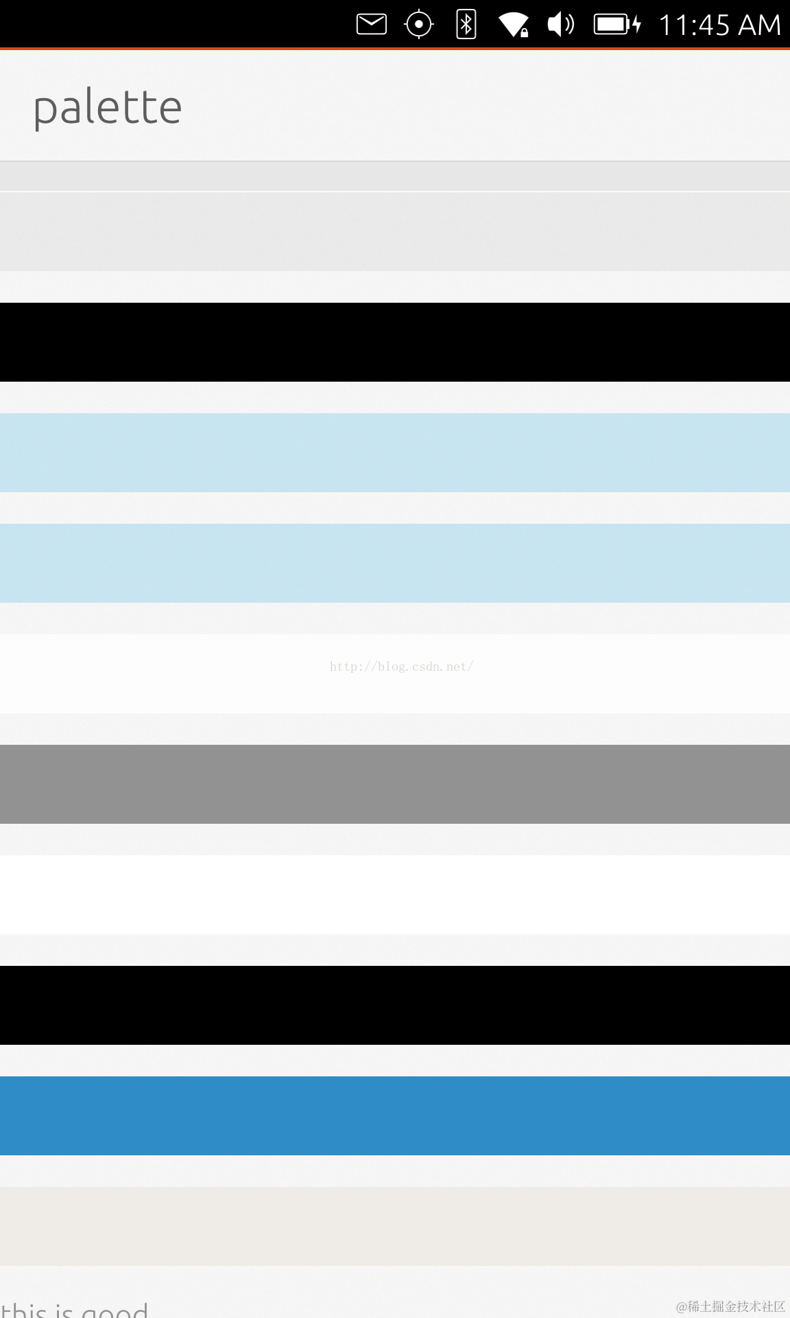 从上面的代码中,我们没有运用自己定义的颜色.相反,我们运用了系统Theme提供的颜色来绘制我们的界面.这样当系统的调色板发生变化后,我们的颜色也将跟着发生变化,我们不需要做任何的修改.