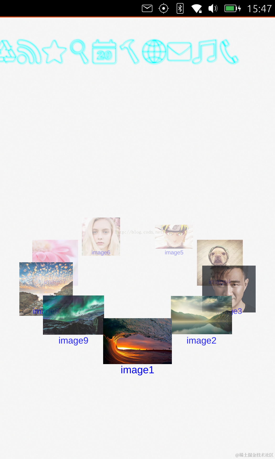 在上面我们定义了一个额外的scale属性.这样它就可以对我们的每个图片定制自己的大小.重新运行我们的应用: