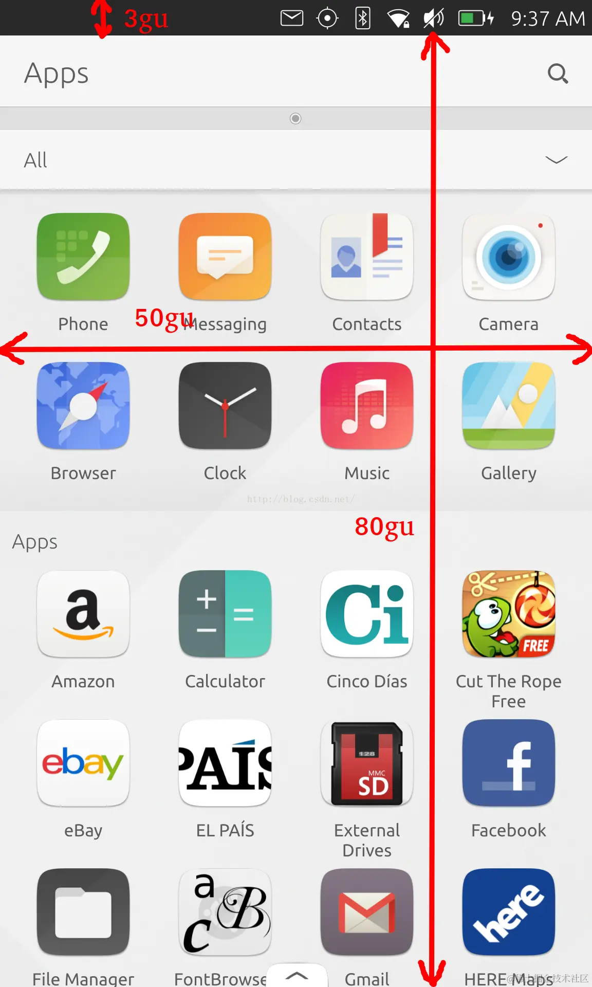 Ubuntu的用户界面工具包的重要功能是把用户定义多个设备尺寸进行匹配。采取的方法是定义一个新的单元类型,网格单元(简写为gu)。网格单位转换为像素值取决于应用程序运行在屏幕上和设备的类型。下面是一些例子:\