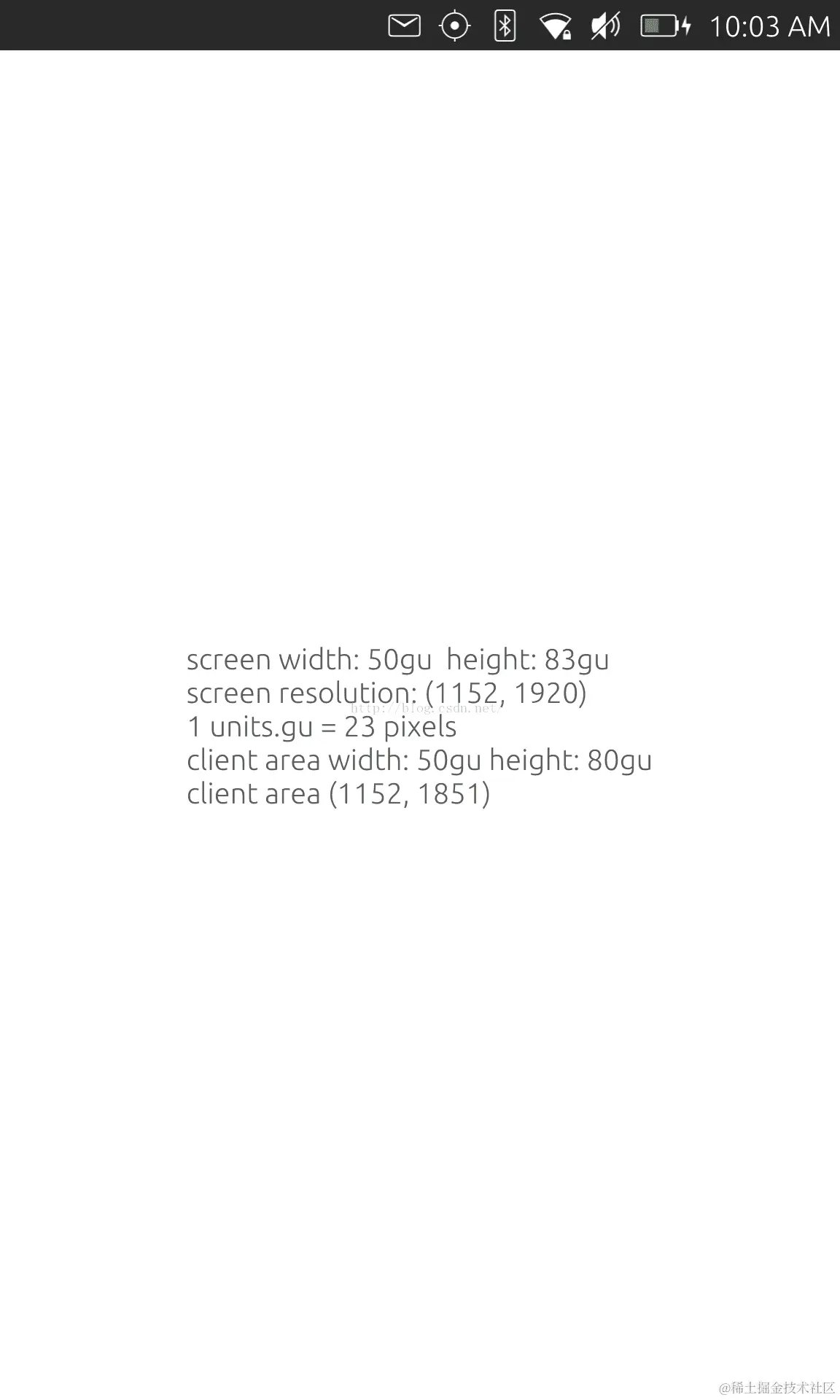 当我们的应用只使用units.gu为长度单位来编程的话,那么无论将来我们的屏幕尺寸变得多大,我们的应用的长宽比不会发生变化,也就是说我们的应用的布局不会发生变化.对我们的MX4来说,宽度为50gu,高度为80gu.如果我们的平板的宽度及高度还是这么定义的话,那么我们的手机应用在平板上的运行将没有任何的变化.只是在平板上每个units.gu对应的pixel的数值将和我们现在的MX4会有不同.