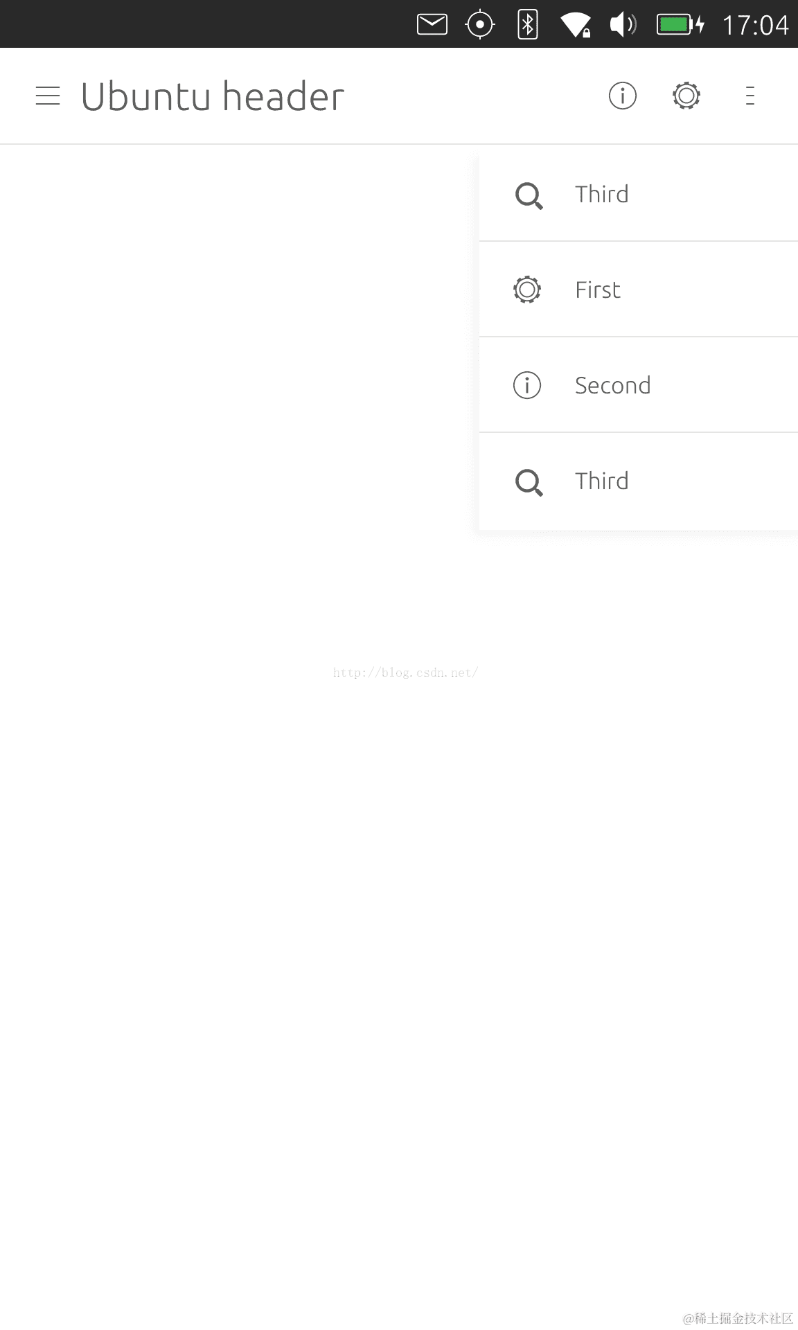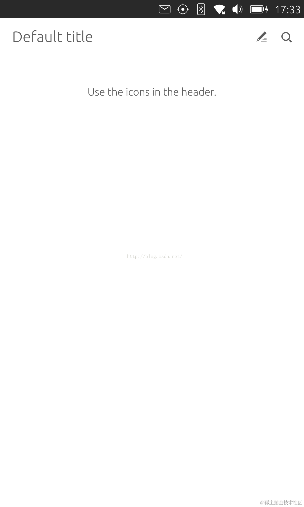 在上面的练习中我们可以随意用一个Item来当做我们的header,但是对于有些应用,我们还是希望有像我们以前Page.title那样的特性来使得我们的每个页面有自己的title等.我们可以使用 PageHeader完成我们所需要的功能.同时PageHeader也可以让我们在header上放上我们所需要的action.我们还是来通过一个例程来展示它的功能: