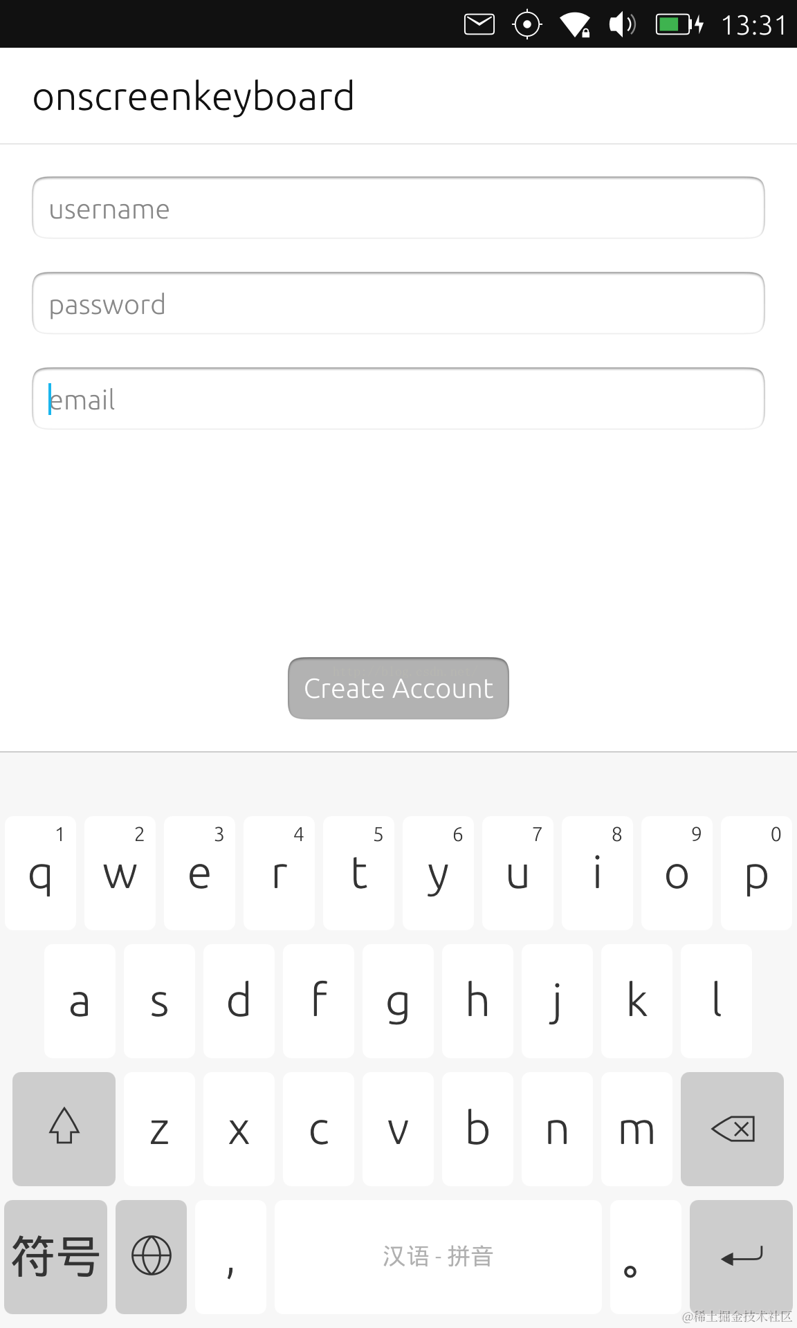 从上面我们可以看出来.当我们点击email进行输入的时候,"Create Account"按钮也自动跑到我们键盘的上面.这样当我们输入完我们的内容的时候,我们可以直接按下按钮来进行创建一个账号,而不用先把键盘弄消失掉,再提交.