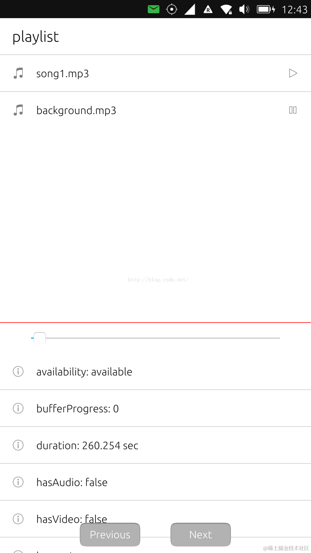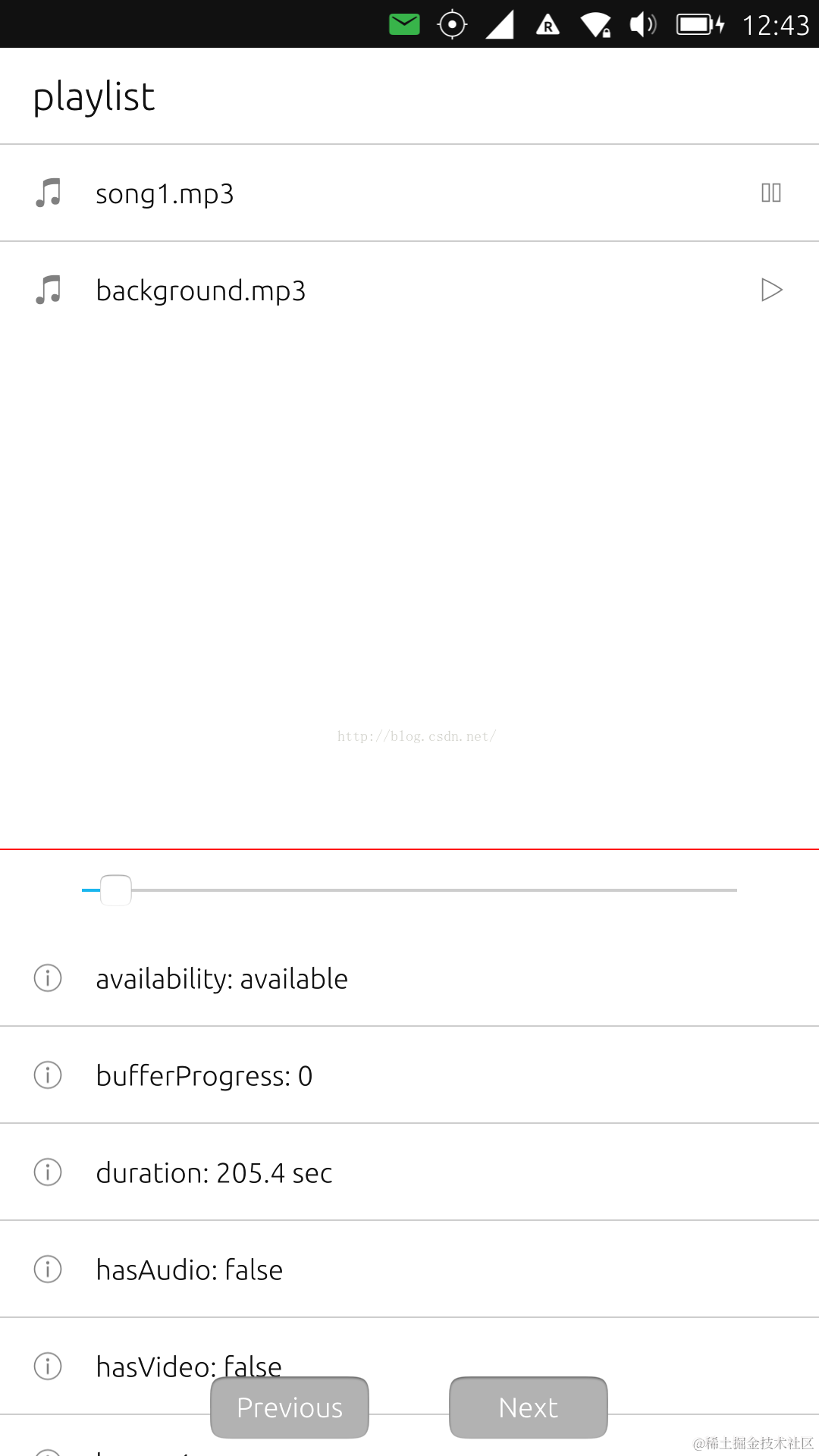 整个的设计还是非常简单.屏幕的上面是一个音乐的列表.下面是一个该音乐文件的状态.由于一些原因,我们目前还不能得到音乐文件的metaData.
