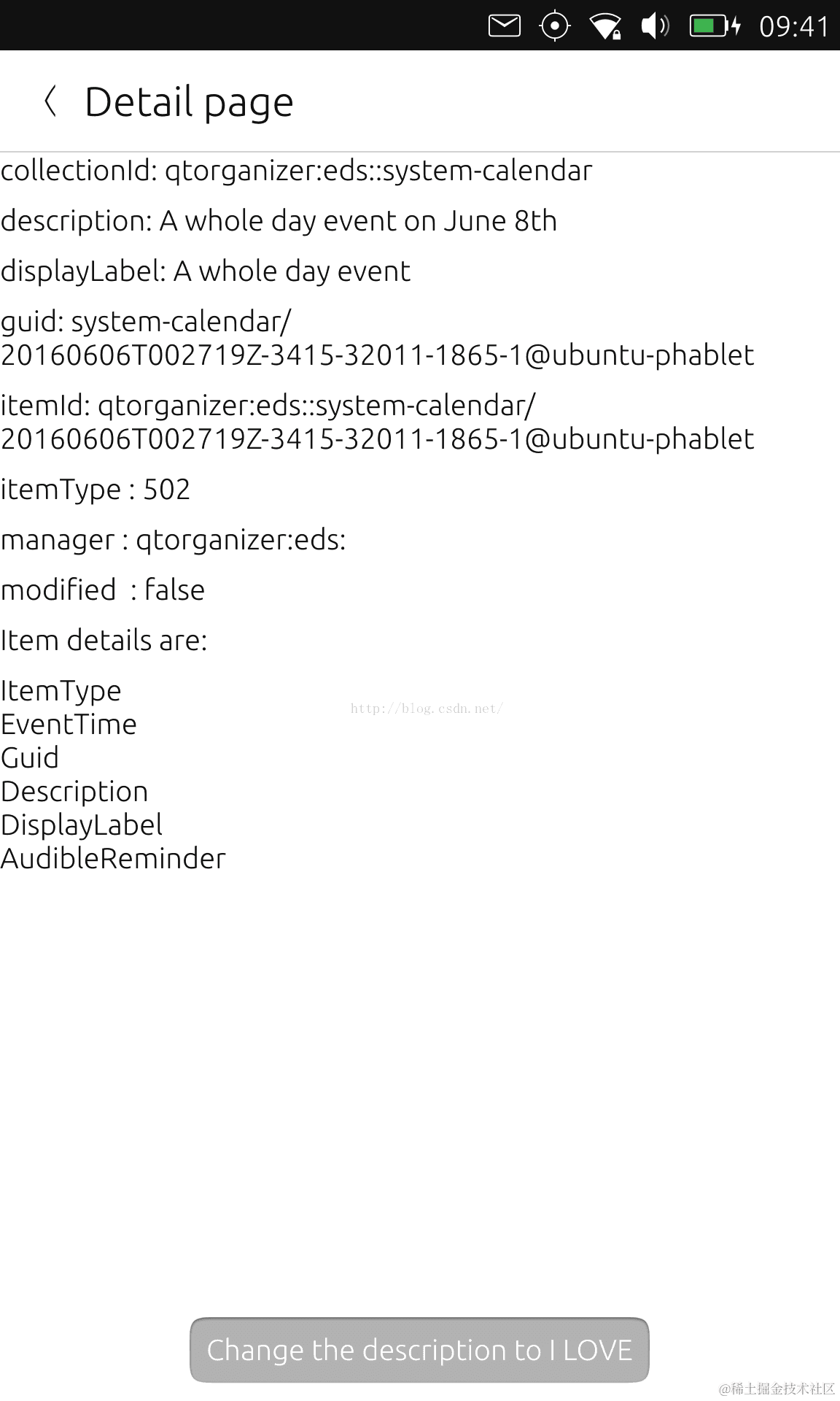 从上面的图中可以看出来,每个事件的具体信息,并展示它所支持的具体的属性项目.我们可以尝试点击最下面的按钮"Change the description to I LOVE"来改变我们的事件的description. 修改过后的列表为: