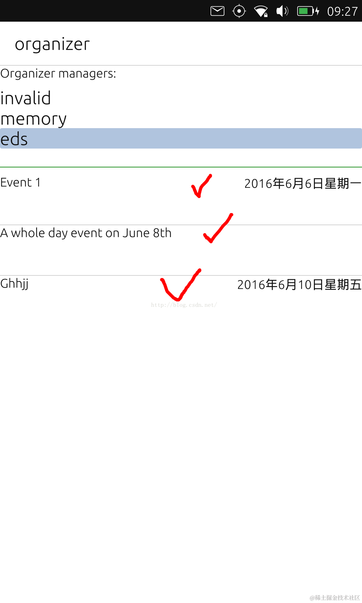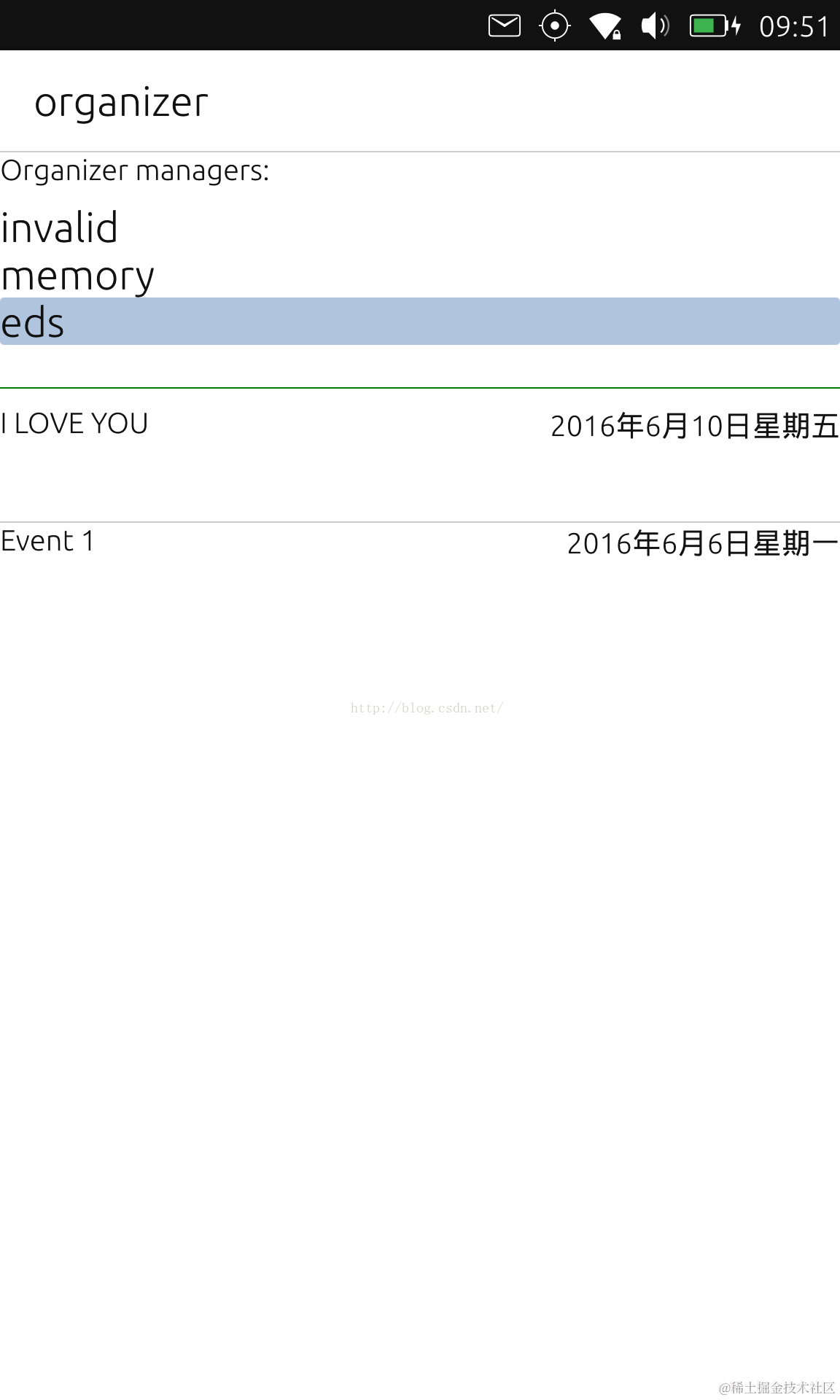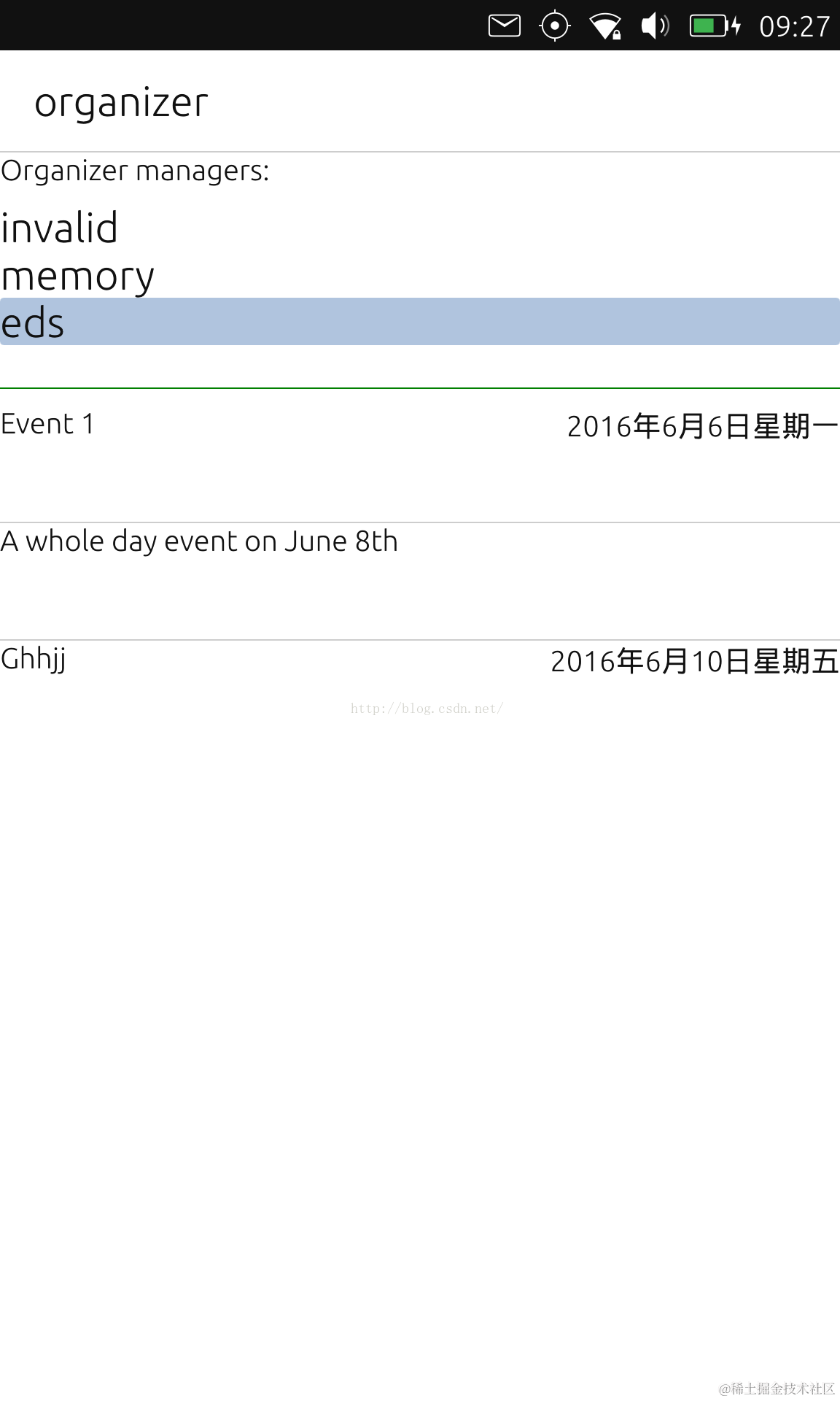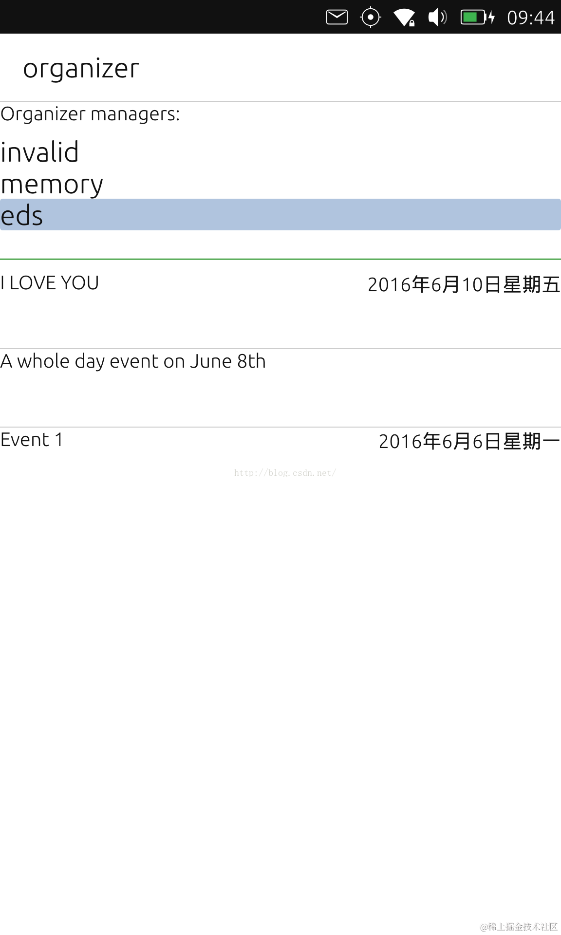 在上面列出了三个manager: invalid,memory及eds.这里的memory可以被用在来导入我们在文件中的一个文件,并最终形成我们可以对一个文件中的事件进行操作.当然,我们也可以实现同步的功能,或导出的动作.具体的例程可以参阅文章" Qt Quick Organizer List View Example".虽然例程中使用的API的有些接口和我们现有的会有所不同,但是我们可以实现同样的功能.在上面图中显示的"eds"就是我们的手机中自动应用"日历"所使用的manager.在接下来的操作中,我们主要来通过这个来进行剖析.