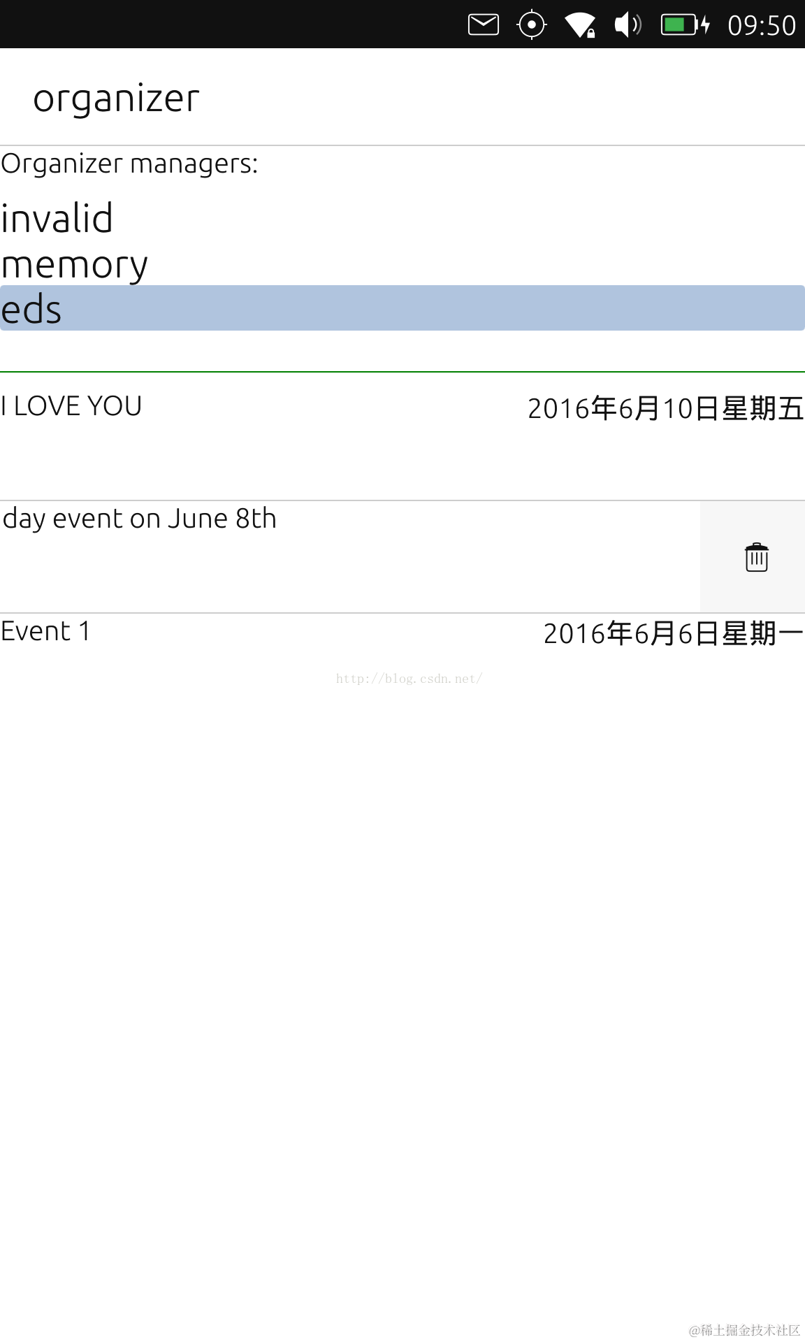 来删除我们不想要的事件.在我们的应用中,我们可以通过向左滑动,显示出删除图标.点击删除图标即可达到删除的目的.