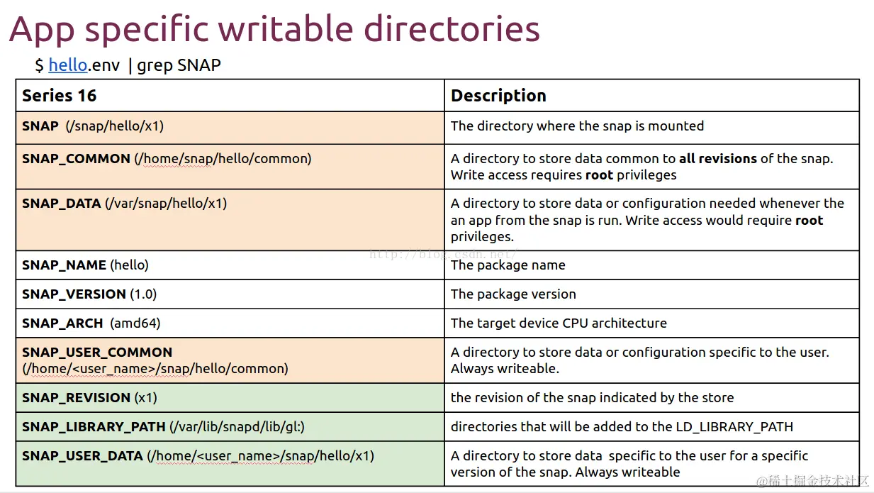 Snap是一个在Ubuntu系统上一个新的技术.如果大家对这个技术还不是很理解的话,可以参阅文章"安装snap应用到Ubuntu 16.4桌面系统".我们知道MySQL及Tomcat是在Java服务器端常用的技术.那么我们怎么来把它打包到我们的snap应用中去呢?很多人可能以为这个很简单.我们可以直接在snapcraft.yaml中使用stage-package来安装现有的debian包,不就可以了吗?其实,由于在snap系统的安全性限制,在一个snap应用被成功安装后,它自己所在的目录是只读的,不可以写入任何的数据.我们只有规定的部分目录才是可以写入的.我们以hello例程为例,我们有如下的目录可以使用: