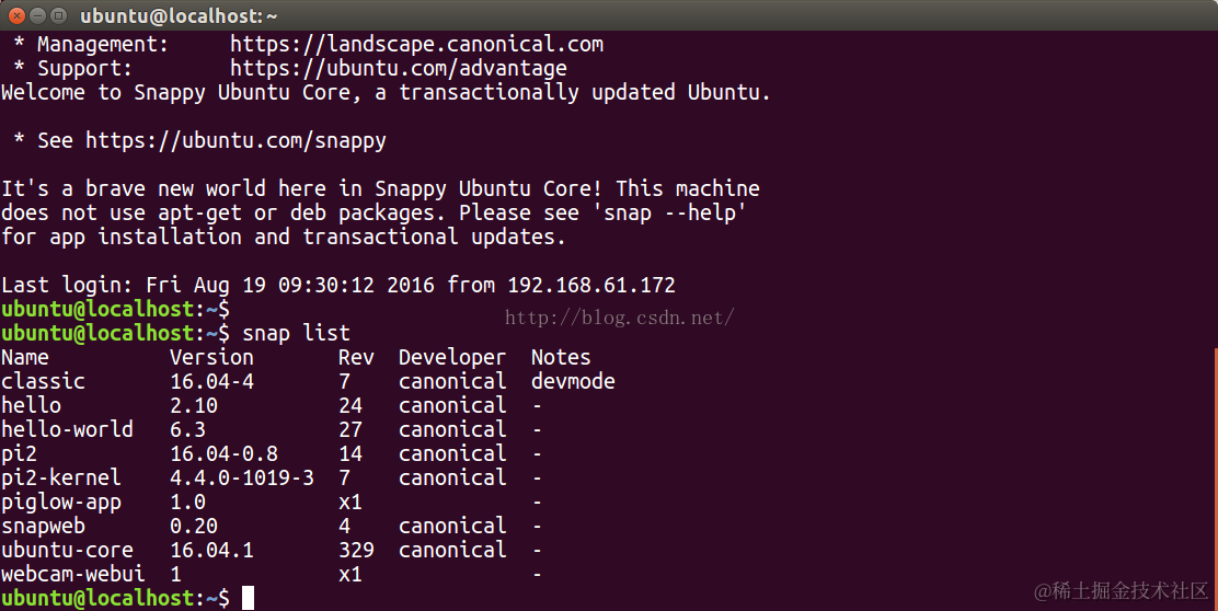 一旦我们连接上我们的树莓派,我们可以参照文章"安装snap应用到Ubuntu 16.4桌面系统"来安装和检查我们的snap系统,比如: