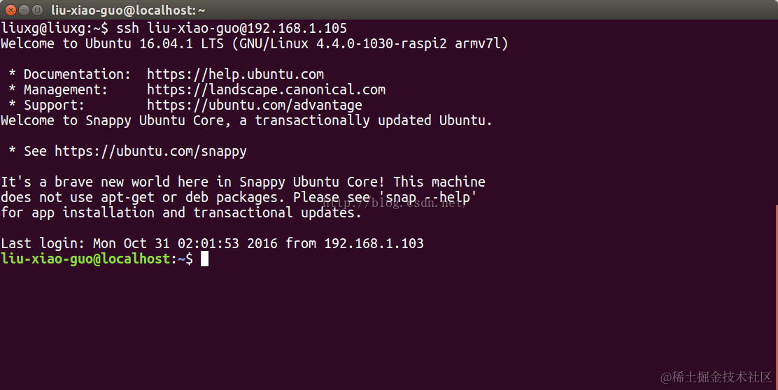 特别值得注意的是,如果是使用最新的Ubuntu Core的软件的话,这里的ubuntu应改为自己的launchpad的用户名.对于我的情况是liu-xiao-guo@your_raspberry_pi_ip_address.