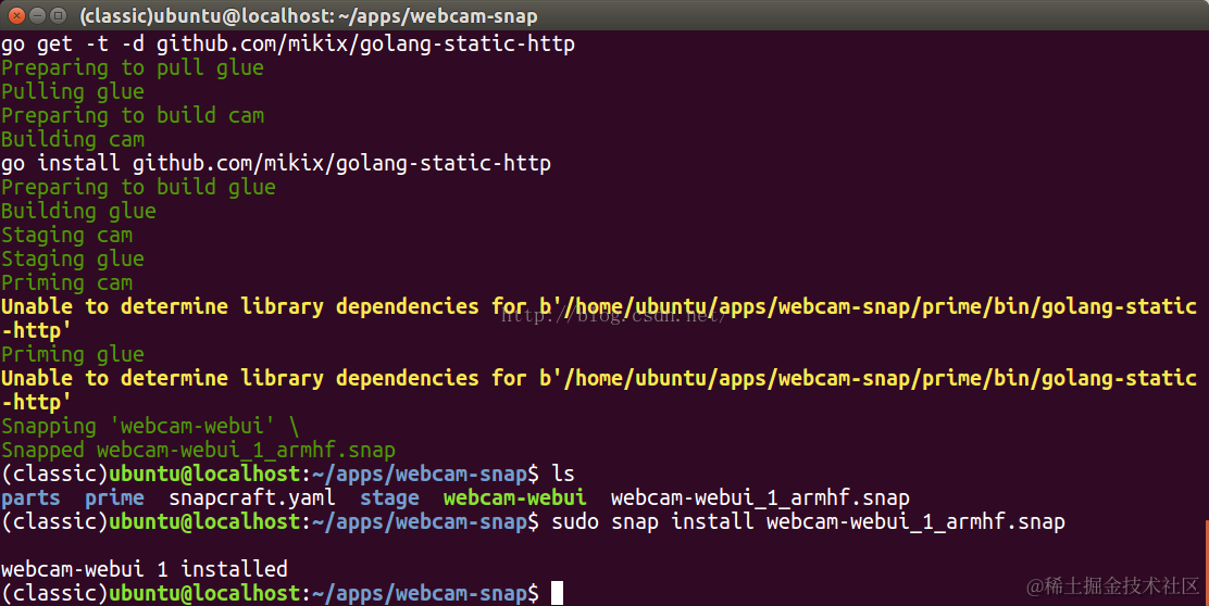 至此,我们已经把我们的项目webcam-webui编译为我们树莓派可以使用的snap了.