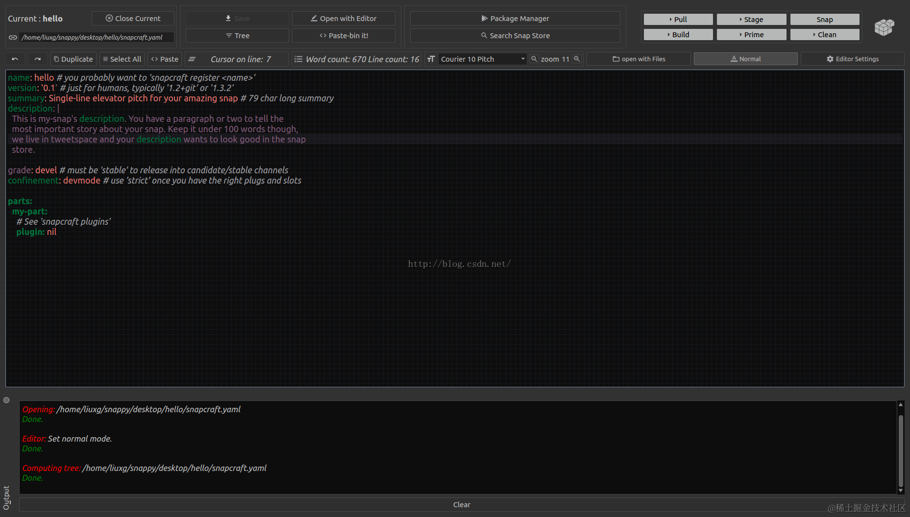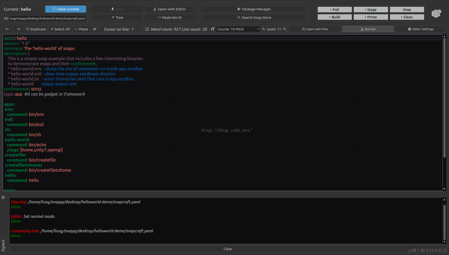 我们可以在上面的工具中,编辑我们的snapcraft.yaml,并调试我们的最终的项目.