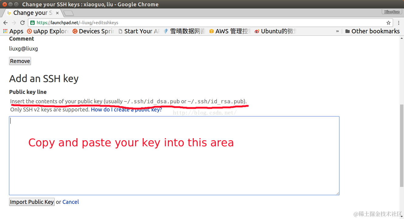 我们点击"SSH keys".紧接着,按照上面的提示,我们把我们Ubuntu Desktop里的 id_rsa.pub里的内容拷贝并粘贴到相应的区域: