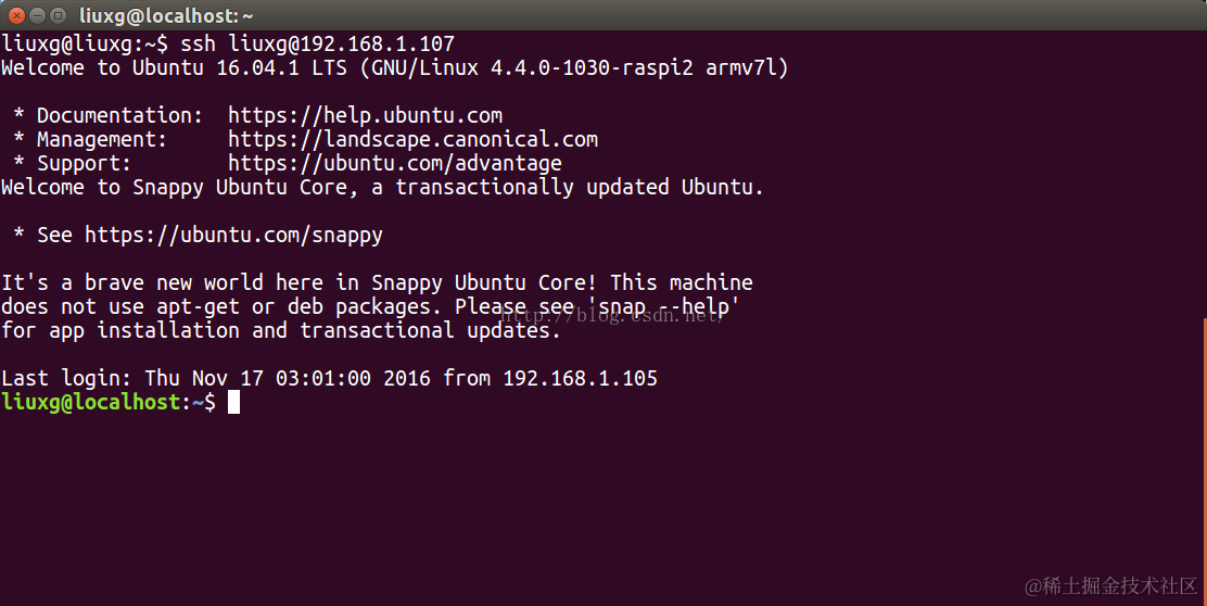 在上面,我们使用了新的Ubuntu One账号xiaoguo.liu@gmail.com.通过这样的方法,我们就把一个新的Ubuntu One账号添加到我们的Ubuntu Core设备中.我们就可以用新的账号liuxg进行登陆.
