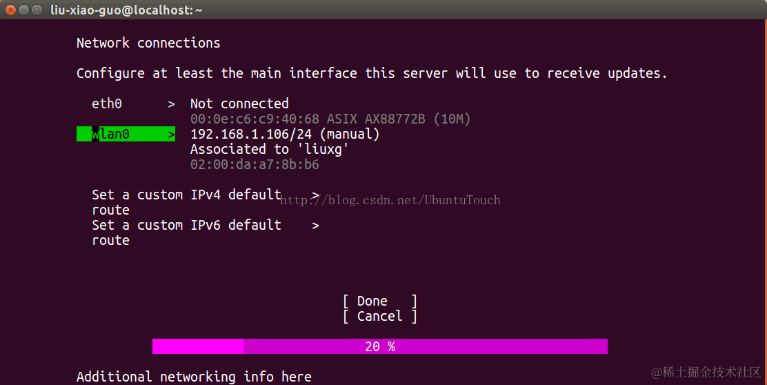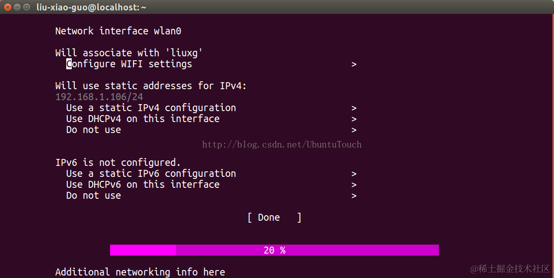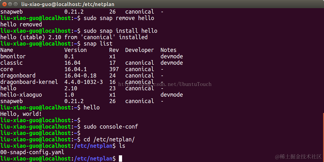 等配置好我们的WiFi后,我们可以安装文章"如何在装上Snappy Ubuntu的树莓派上启动WiFi"中所介绍的那样来通过路由器来找到我们的Ubuntu Core设备地址.然后,再通过: