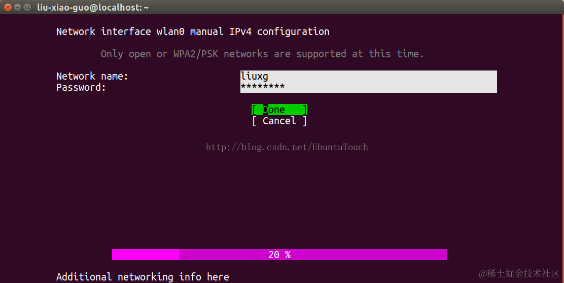 当我们把Ubuntu Core系统第一次启动时,我们要进入到 console-conf的设置中.在配置的过程中,我们可以安装提示的顺序,并选择WLAN来设置.具体的步骤如下: