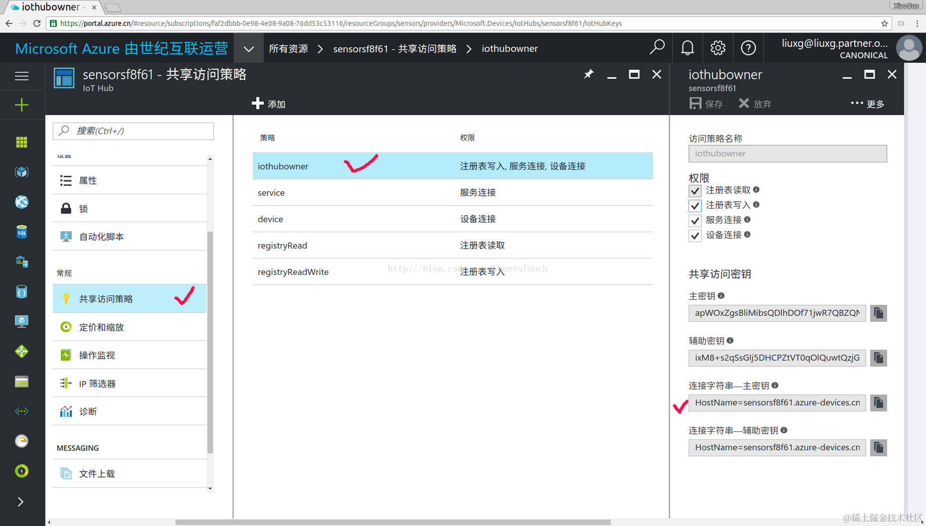 这里显示的"连接字符串-主秘钥"对我们以后的编程是非常有用的.需要特别留意一下.