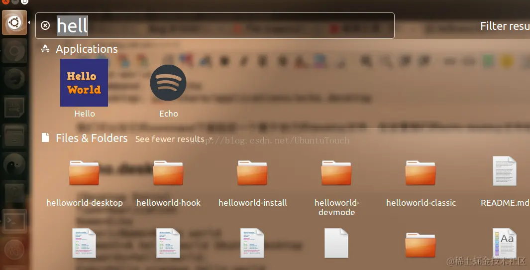 在这里它指定了自己的执行文件及一个属于自己的icon.我们打包我们的应用,并安装.在Ubuntu Desktop的dash中,我们可以看到: