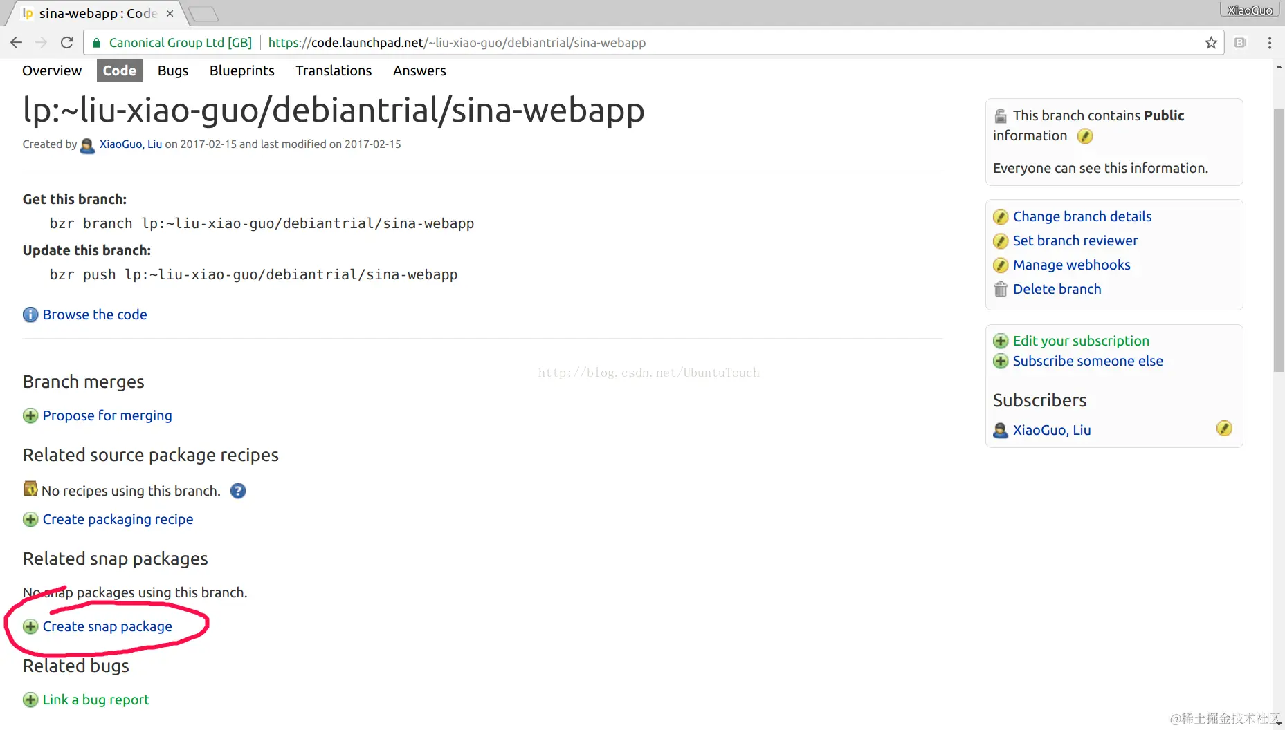 我们可以把我们的代码放到 launchpad.net/。比如我已经创建好了一个我自己的项目: