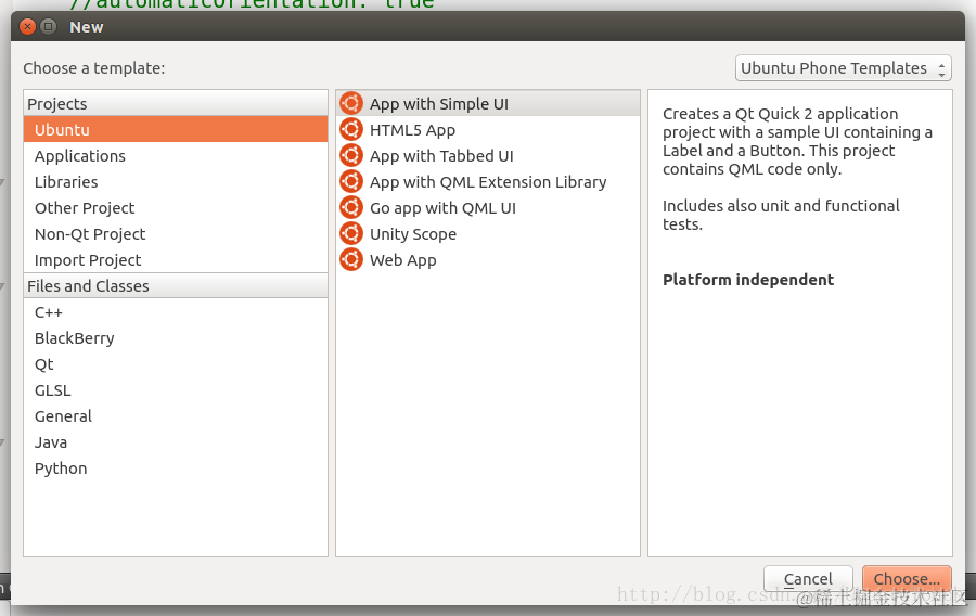 我们使用Qt Creator来创建一个最基本的QML应用。我们选择使用“App with Simple UI"模版来创建我们的应用。