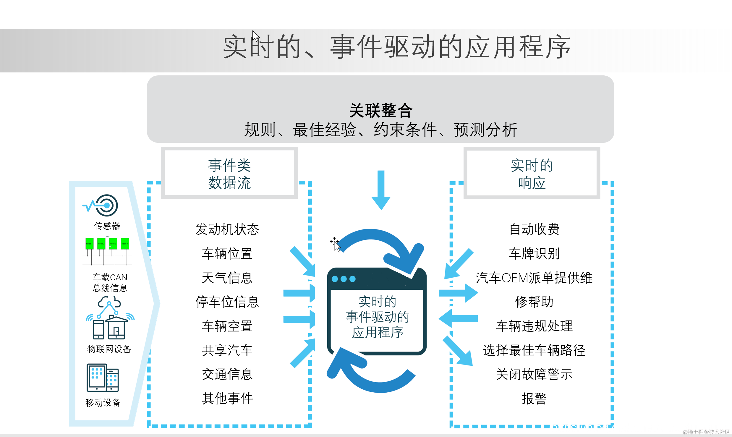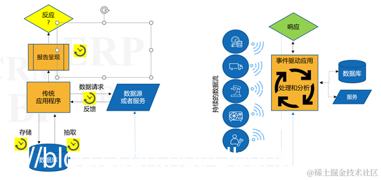 传统的业务逻辑一般是由用户发起的用户驱动架构。这种架构通常是由用户发起(user-driven),然后把数据存入到服务器中,事后再有单独的用户界面来对存储的数据进行处理呈现或触发。所有的事情都是又数据库来进行协调。这种事件处理不具备实时性。