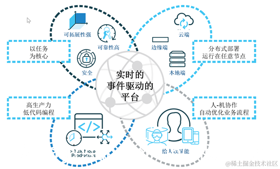 - Collaboration开发(协作开发)。对于在应用中的场景触发的事件,我们可以通过短信,邮件,信息通知等方式来通知用户,并根据场景来提供用户来参与业务流程的处理等。