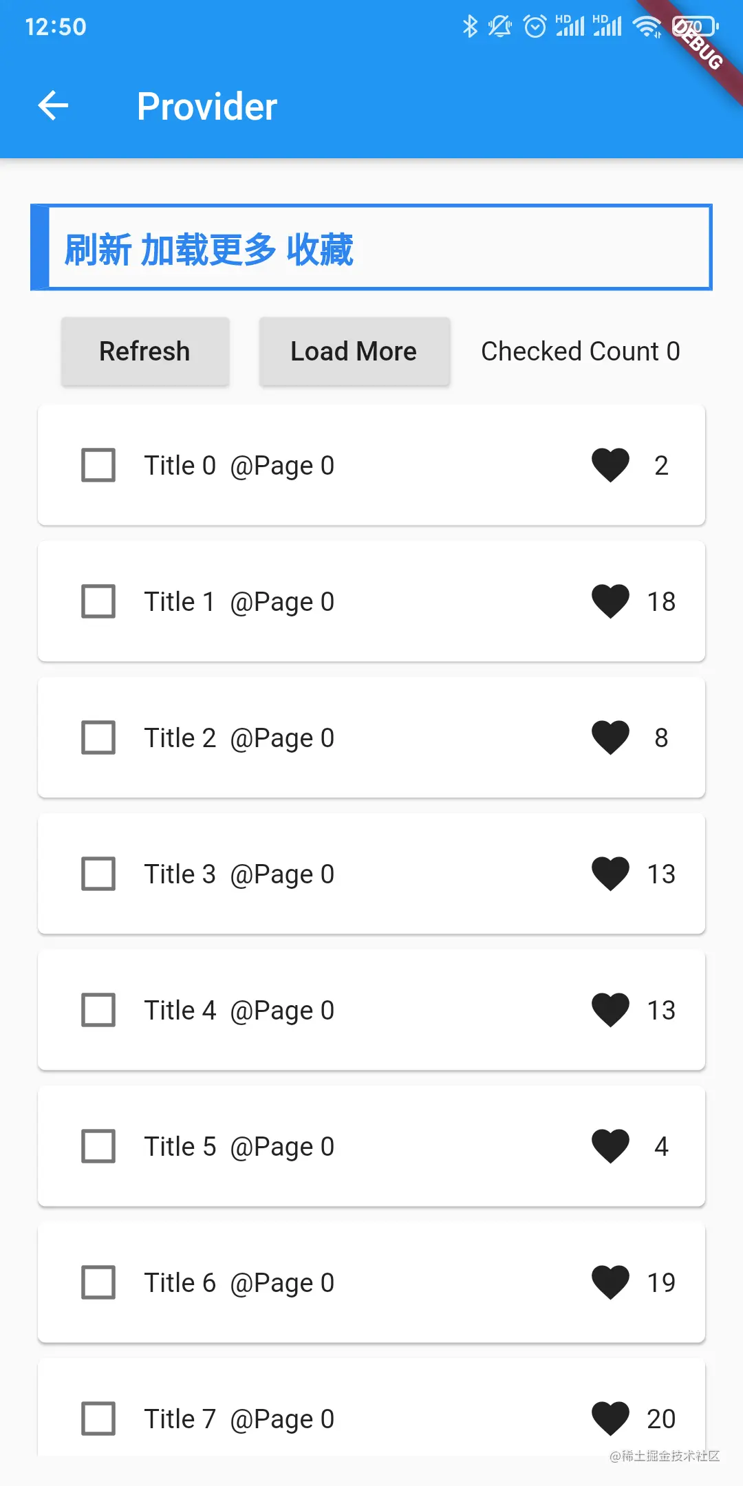 为了简化Demo,让读者专注于Provider的使用,这里并没有使用下拉刷新和上拉加载的框架,而是通过两个Button来模拟这两个操作,同时,每个Item都提供了一个CheckBox,用于演示单个Item的刷新。