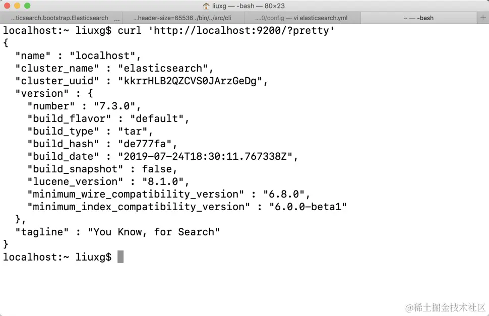 除了上面用浏览器的方式来检查我们的 Elasticsearch 是否正确运行以外,我们还可以通过如下的命令行来运行: