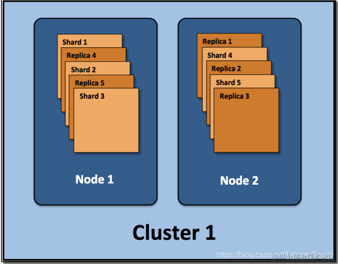 下面的图表示的是一个 index 有5个 shard 及1个 replica