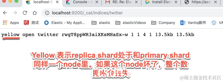 如果一个 index 显示的是红色,表面这个 index 至少有一个 primary shard 没有被正确分配,并且有的 shard 及其相应的 replica 已经不能正常访问。 如果是绿色,表明 index 的每一个 shard 都有备份 (replica),并且其备份也成功复制在相应的 replica shard 之中。如果其中的一个 node 坏了,相应的另外一个 node 的 replica 将起作用,从而不会造成数据的丢失。
