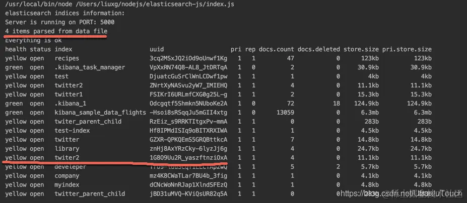 如果我们的 index.js 运行成功的话,它将在 PORT:5000 口地址上。而我们的 Elasticsearch 服务器运行在 PORT:9200 上。显示的结果如下: