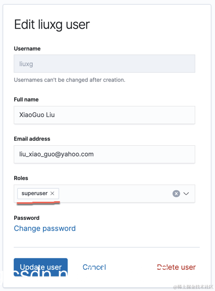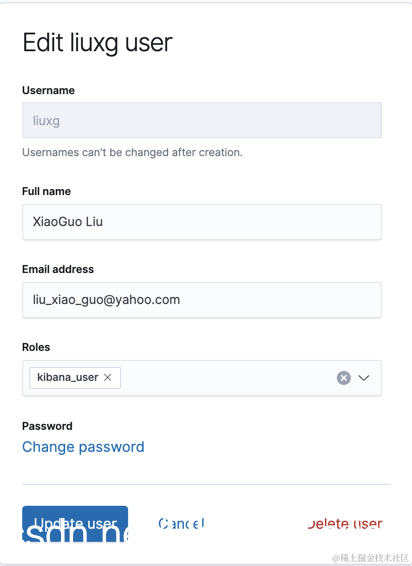 我们将 kibana_use r角色分配给你的用户。 返回 Management / Security / Users 页面并选择你的用户。 添加 kibana_user 角色并保存更改。 例如: