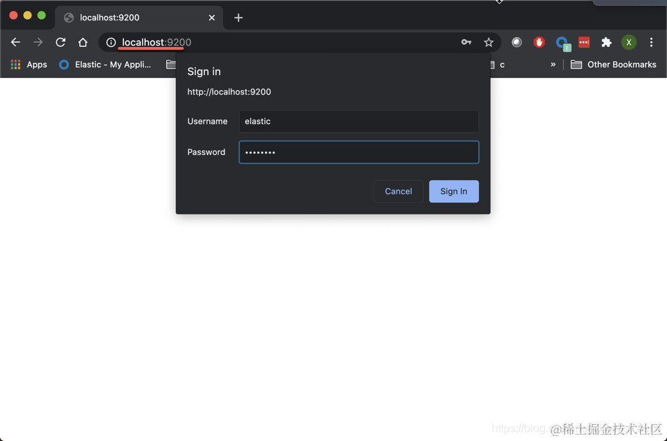 在这里, elastic 是超级用户的用户名,password 是我们设置的密码。我们也可以在浏览器中尝试访问 Elasticsearch: