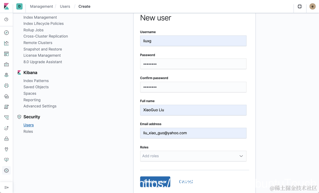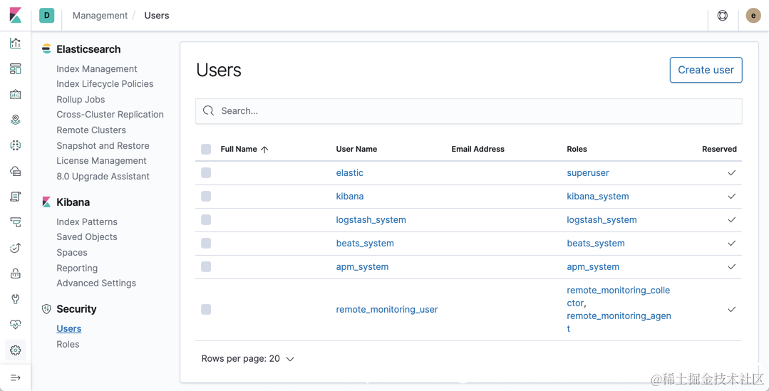 在上面,我们已经使用内置用户 elastic 登录我们的 Kibana。现在我们去 Manage/Sercurity/Users 页面:
