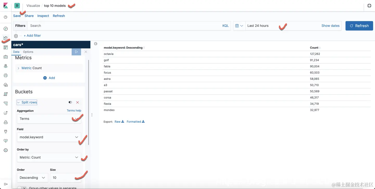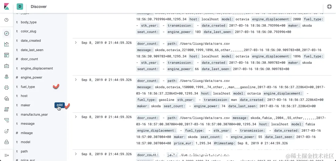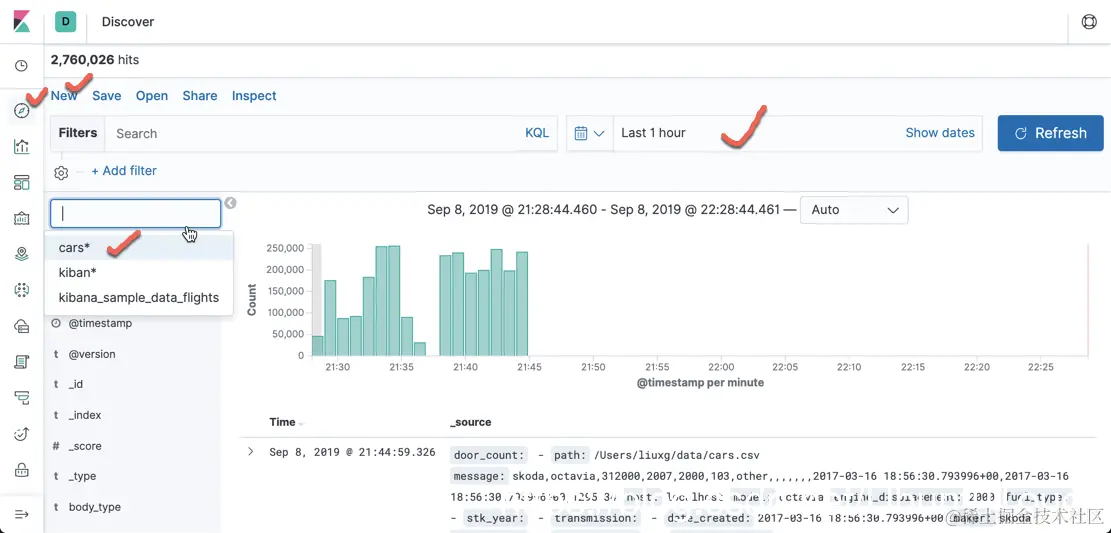 同时如果我们这在 Kibana 上可以看到正在 index 的 cars index数量(count)是一直变化的。