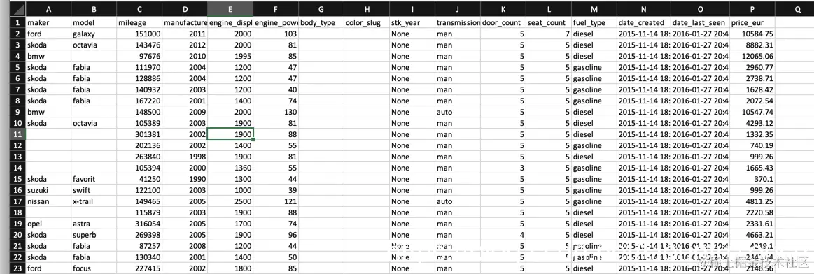 这是一个非常大的文件。在这个文件里,我们可以看到 maker, model, mileage, manufacture 等等字段。