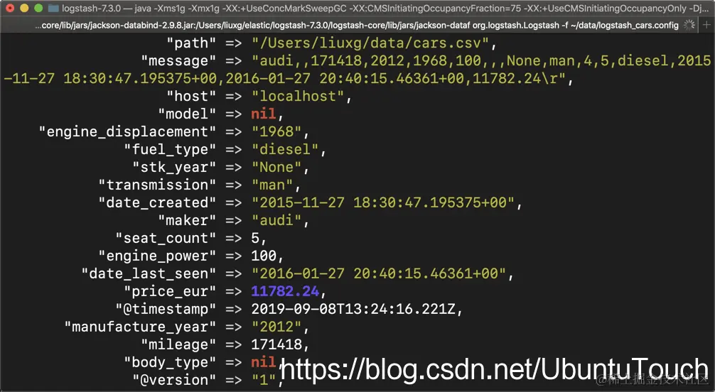 - 在 output 之中,我们制定本地的 Elasticsearch 为我们的数据库,它的 index 是 cars,同时 document_type 为_doc。我们也同时使用 stdout,这样我们可以在terminal屏幕中看出数据在处理之中