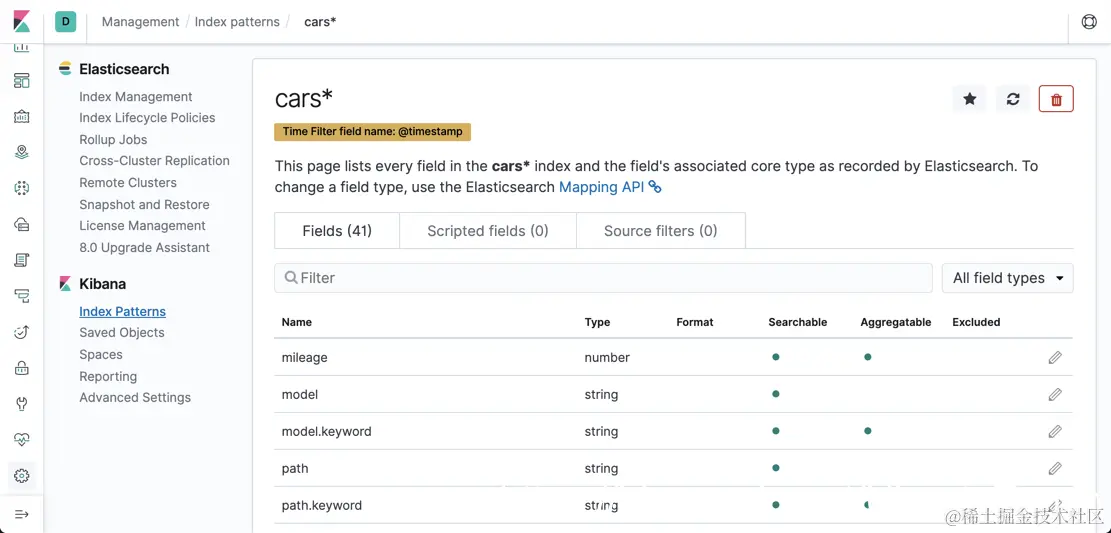 我们可以看到 Elasticsearch 已经为我们创建好了 mapping,并且它们的数据类型也可以看到: