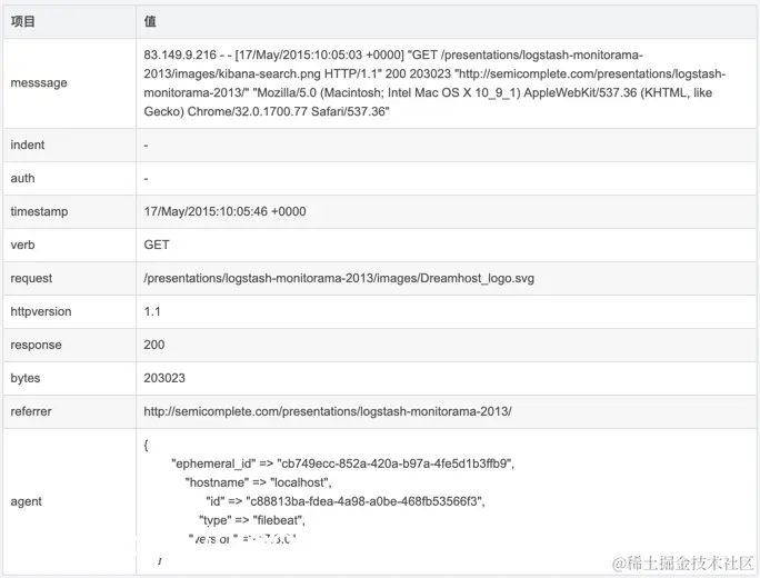 83.149.9.216 - - [17/May/2015:10:05:03 +0000] "GET /presentations/logstash-monitorama-2013/images/kibana-search.png HTTP/1.1" 200 203023 "semicomplete.com/presentatio…" "Mozilla/5.0 (Macintosh; Intel Mac OS X 10_9_1) AppleWebKit/537.36 (KHTML, like Gecko) Chrome/32.0.1700.77 Safari/537.36"
